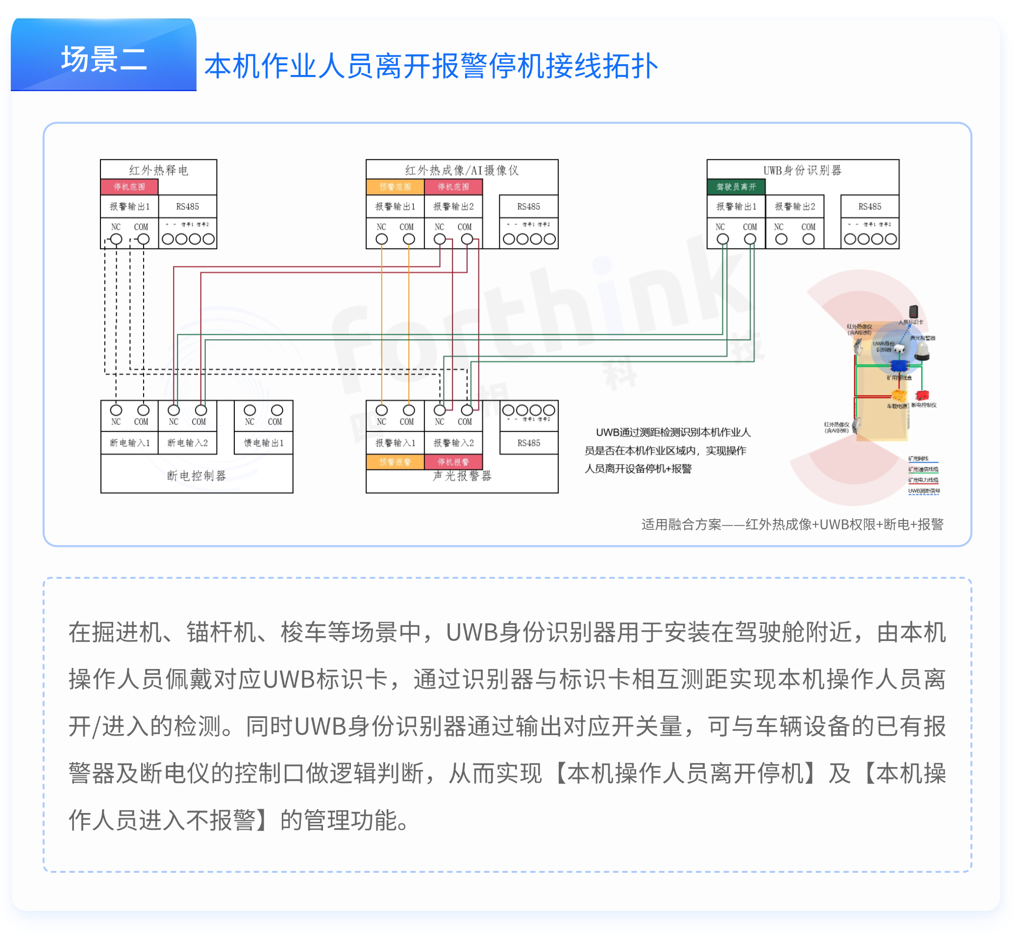 四相科技礦用人員接近防護(hù)系統(tǒng)(UWB人員身份識別方案)可融合紅外熱釋電傳感器、可見光攝像儀AI識別、紅外熱像儀AI識別以及UWB高精度定位測距技術(shù),靈活配置,高性價(jià)比。其中UWB人員身份識別系統(tǒng)由UWB人員身份識別器和UWB標(biāo)識卡組成。