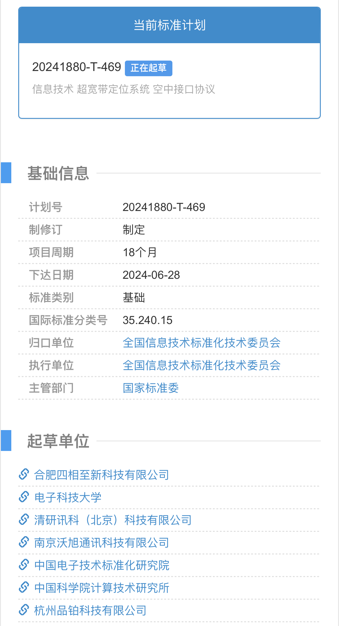 2024年6月28日,國家標(biāo)準(zhǔn)化管理委員會下達了2024年第四批推薦性國家標(biāo)準(zhǔn)計劃和推薦性國家標(biāo)準(zhǔn)外文版計劃的通知。四相科技聯(lián)合其他科研院所、企業(yè)單位,牽頭起草國家標(biāo)準(zhǔn)計劃《信息技術(shù) 超寬帶定位系統(tǒng) 空中接口協(xié)議》。該標(biāo)準(zhǔn)規(guī)定了超寬帶定位系統(tǒng)的參考模型、物理層協(xié)議和MAC層協(xié)議,適用于超寬帶定位系統(tǒng)的設(shè)計、生產(chǎn)、使用和測試。協(xié)議通過后,將促進超寬帶定位技術(shù)的進一步創(chuàng)新和應(yīng)用推廣。