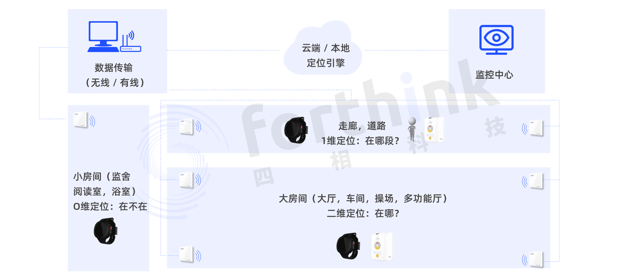 四相采用厘米級超高精度UWB、藍(lán)牙多模融合定位技術(shù),結(jié)合傳統(tǒng)FRID技術(shù)、視頻監(jiān)控技術(shù),為監(jiān)獄的信息化改造提供智能化一體解決方案。通過在監(jiān)獄部署定位基站,并為犯人和獄警佩戴定位標(biāo)簽卡的形式,來獲取精準(zhǔn)位置信息。通過案例積累,自主研發(fā)智能化、信息化的物聯(lián)網(wǎng)安全平臺,助力監(jiān)獄加強(qiáng)安全監(jiān)管力度,全方位提升安全監(jiān)管效率,降低管理風(fēng)險(xiǎn)。