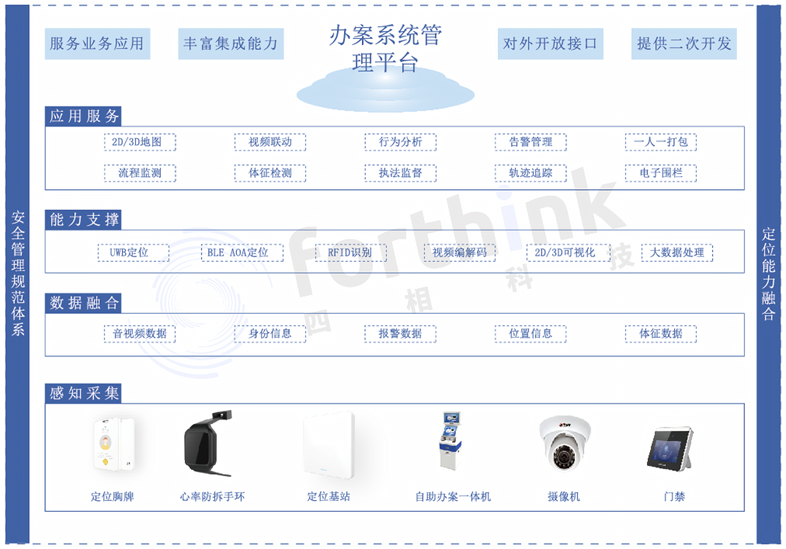 四相科技公安辦案區(qū)人員定位解決方案,基于UWB、BLE AOA、RFID識別等多維定位技術(shù),圍繞“位置賦能行業(yè),數(shù)據(jù)支撐業(yè)務(wù)”的價值體系,采用多種技術(shù)融合及多種定位并行的方式,實現(xiàn)高精度、低成本建設(shè)。