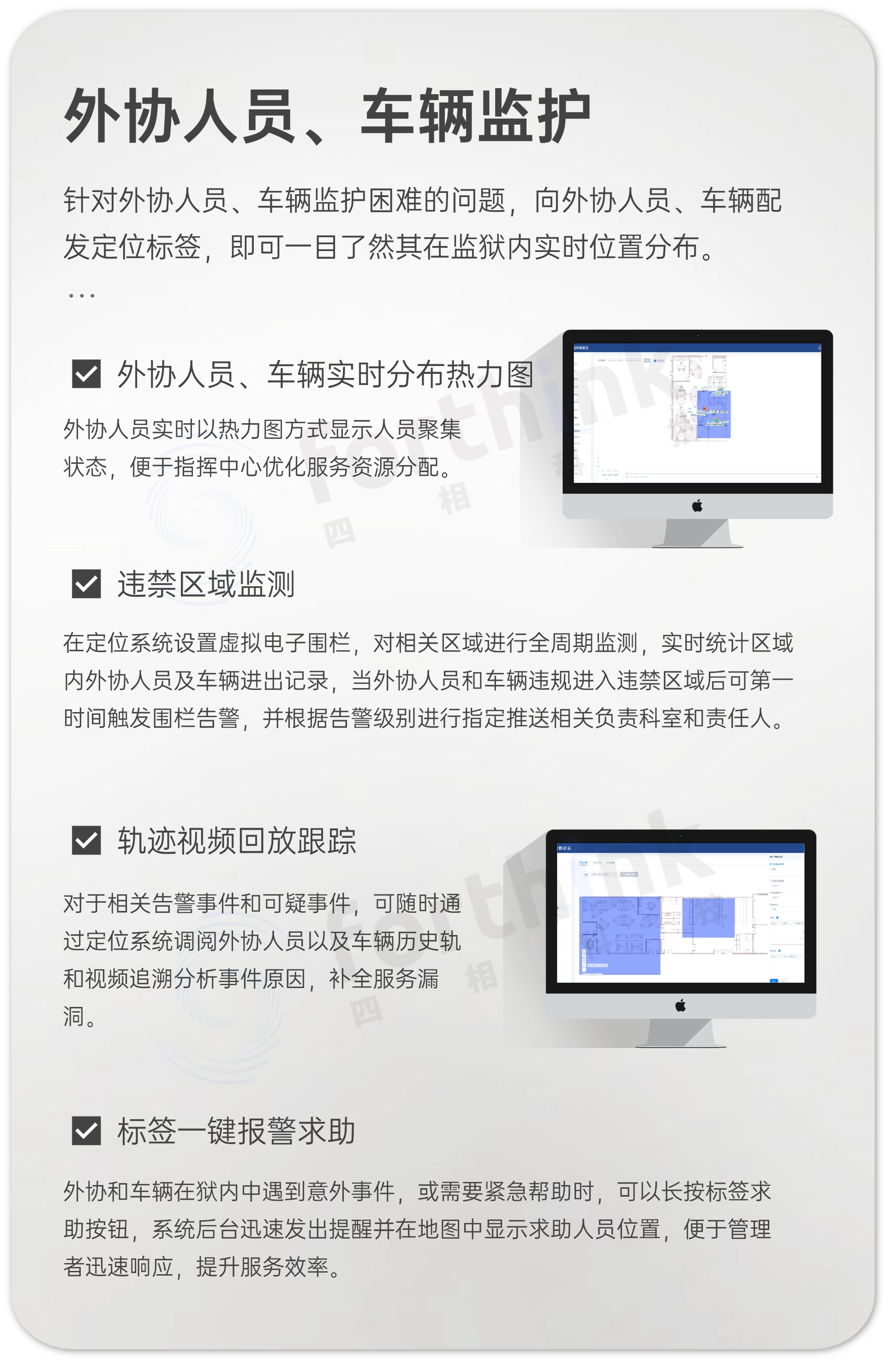 為提高監(jiān)區(qū)管理工作的安防水平,實(shí)時(shí)分析服刑人員行為和管控外協(xié)人員、車輛,四相科技為某女子監(jiān)獄打造了一套智慧監(jiān)獄位置物聯(lián)網(wǎng)整體解決方案。