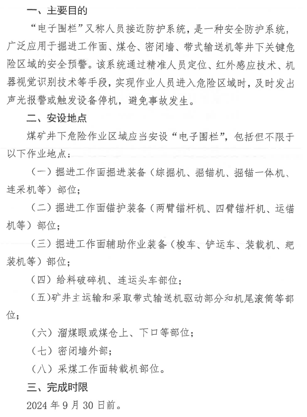 今年4月份,國家礦山安全監(jiān)察局公布,2025年一季度全國礦山事故起數(shù)和遇難人數(shù)同比分別下降3.7%和29.3%,較大事故起數(shù)和遇難人數(shù)大幅下降66.7%和84.2%,為近十年同期最低,這一系列數(shù)據(jù)表明智能化安全管理成效顯著。其中,礦用人員接近防護(hù)系統(tǒng)(井下危險(xiǎn)作業(yè)區(qū)電子圍欄)是井下安全管理的重要一環(huán)。2024年,為汲取事故教訓(xùn),防范井下采煤機(jī)、掘進(jìn)機(jī)傷人事故,山西局等部門要求全省煤礦在9月30日前完成井下危險(xiǎn)區(qū)域電子圍欄安裝,強(qiáng)化井下危險(xiǎn)作業(yè)區(qū)域管理安全管理。