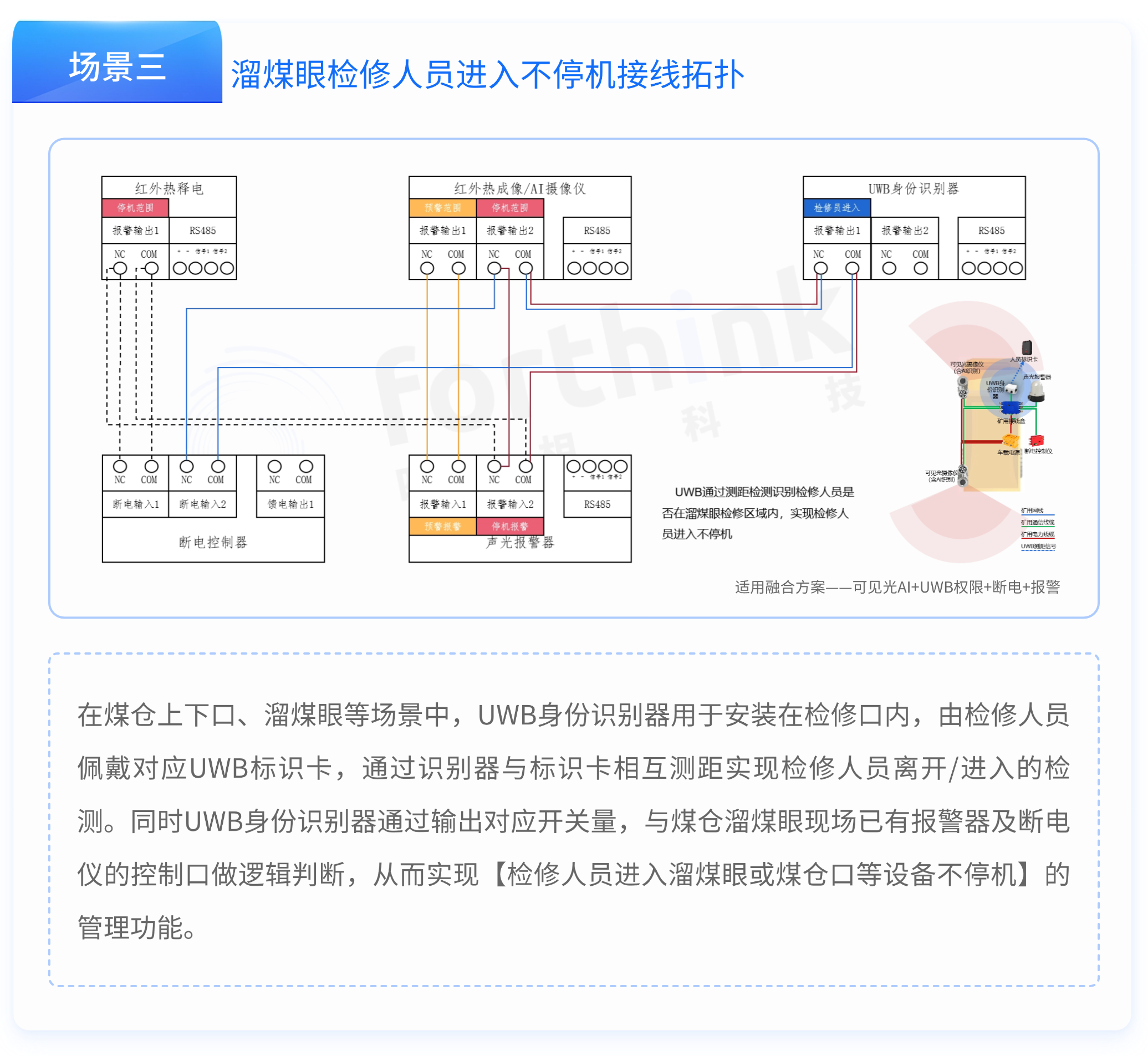 四相科技礦用人員接近防護(hù)系統(tǒng)(UWB人員身份識別方案)可融合紅外熱釋電傳感器、可見光攝像儀AI識別、紅外熱像儀AI識別以及UWB高精度定位測距技術(shù),靈活配置,高性價(jià)比。其中UWB人員身份識別系統(tǒng)由UWB人員身份識別器和UWB標(biāo)識卡組成。