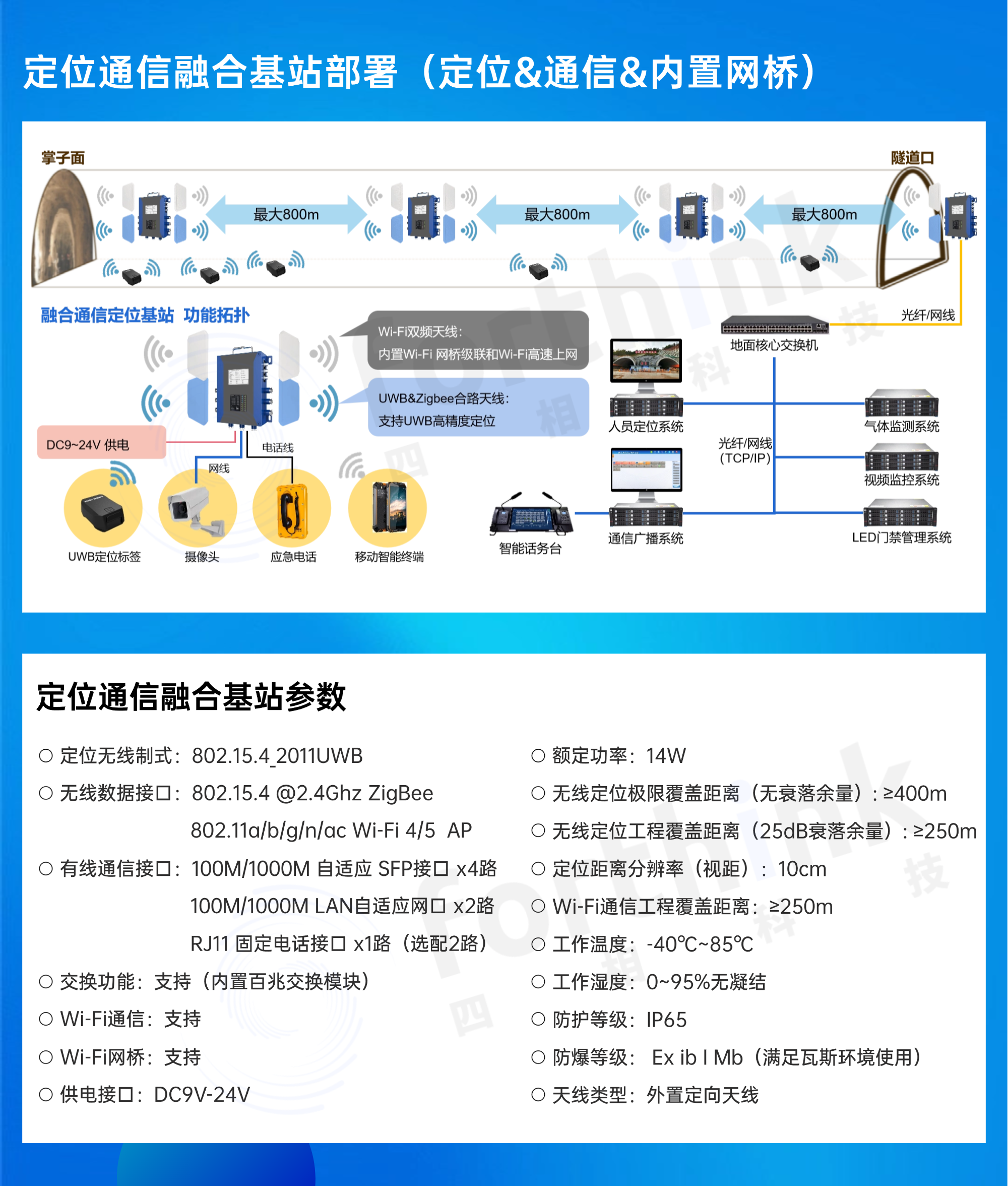 四相科技采用UWB雙通道測距定位技術(shù),融合Wi-Fi通信技術(shù),打造隧道施工安全人車智能位置管理系統(tǒng),可與其他系統(tǒng)進(jìn)行對接,打造包括隧道人員精確定位、隧道安全步距監(jiān)測、Wi-Fi融合通信、固定電話通信、隧道門禁對接、LED顯示大屏對接、隧道視頻監(jiān)控等在內(nèi)的隧道施工安全信息化整體解決方案,系統(tǒng)完整性強,滿足隧道施工安全管理標(biāo)準(zhǔn)。
