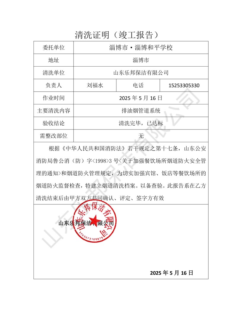 淄博市·淄博和平學(xué)校清洗報告25.5.16