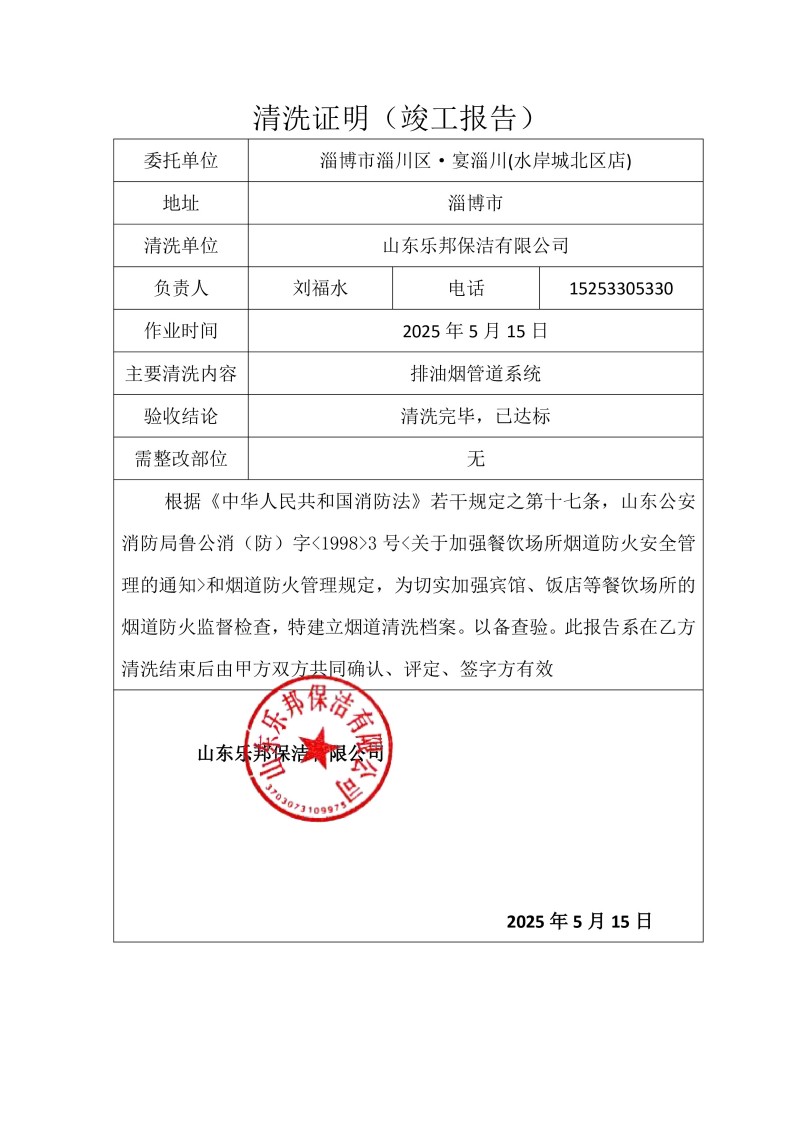 淄博市淄川區(qū)·淄川宴壹號會館清洗報告25.5.15